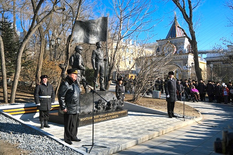 В Адмиральском сквере Владивостока открыли памятник морским пехотинцам. Это событие приурочили к 320-летию создания морской пехоты России. Автор памятника — скульптор Студии военных художников имени М.Б. Грекова Дмитрий Клавсуц.